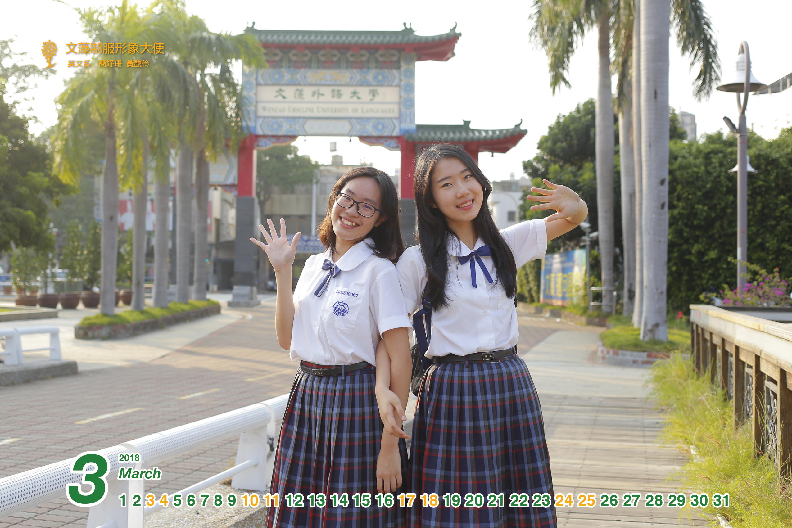 - 活動內容:制服形象大使通過初選者.可參與文藻制服拍攝作業,再經由評審評選出12張最具文藻形象的照片登錄『文藻2018年專科部制服桌曆』,照片中除了展現本校學生穿著制服之優雅氣質,更可帶入文藻校園之美及豐富的社團活動照,除了重塑文藻制服形象,提倡穿著制服風氣,也藉此對外行銷文藻。